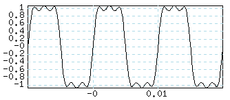 Wie man sehen kann, sind nur drei Faktoren ungleich Null. Das addierte Signal kommt einer Rechteckschwingung schon sehr nahe.